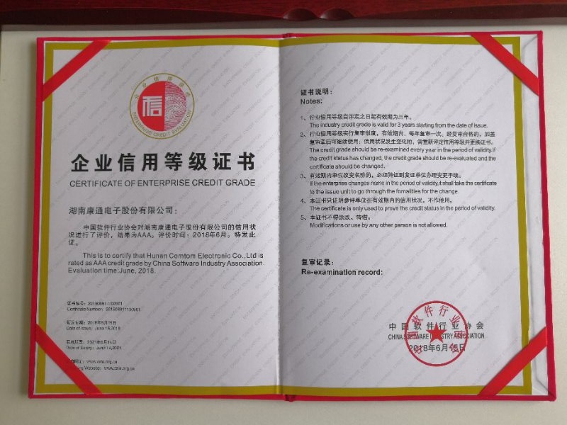 2018年6月,在工業和信息化部的業務指導下,根據中國軟件行業協會《中國軟件服務業企業信用評價管理辦法》,經過企業申報、資料審核、專家評審等過程,中國軟件行業協會公示了2018年(第十四批次)中國軟件和信息服務業信用評價等級的企業名單,湖南康通電子股份有限公司獲評企業信用評價AAA級資質認證。