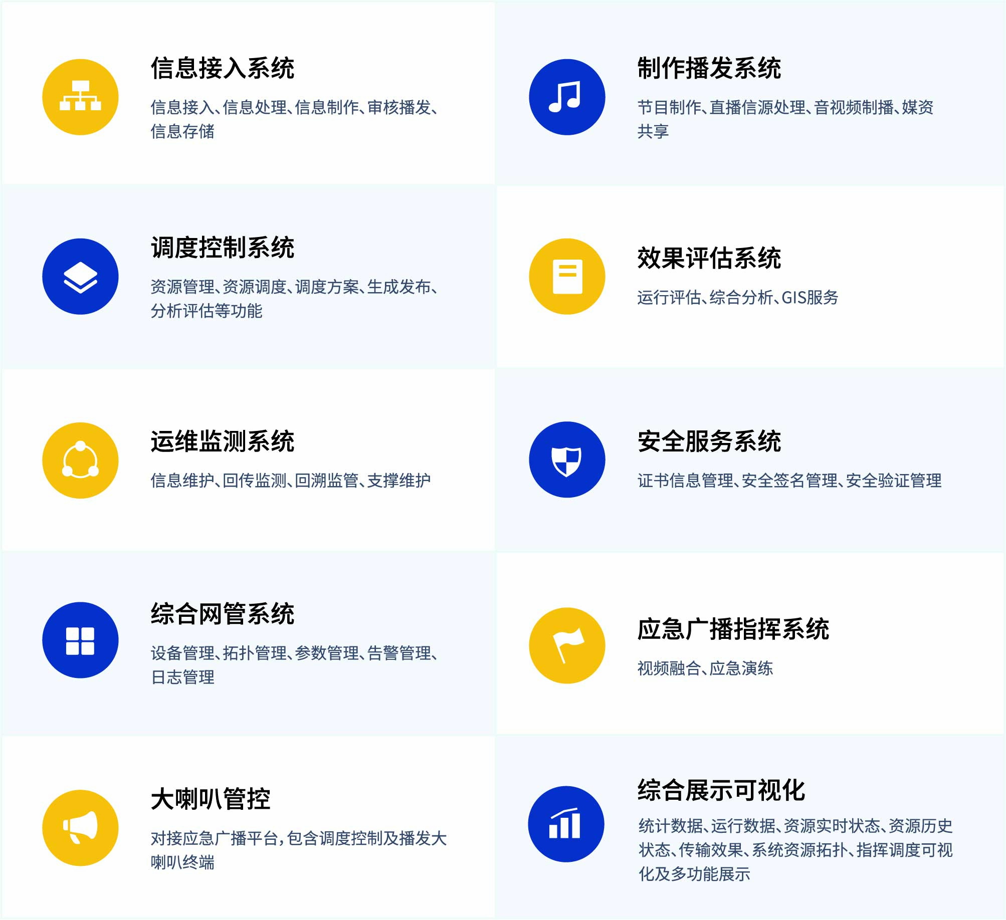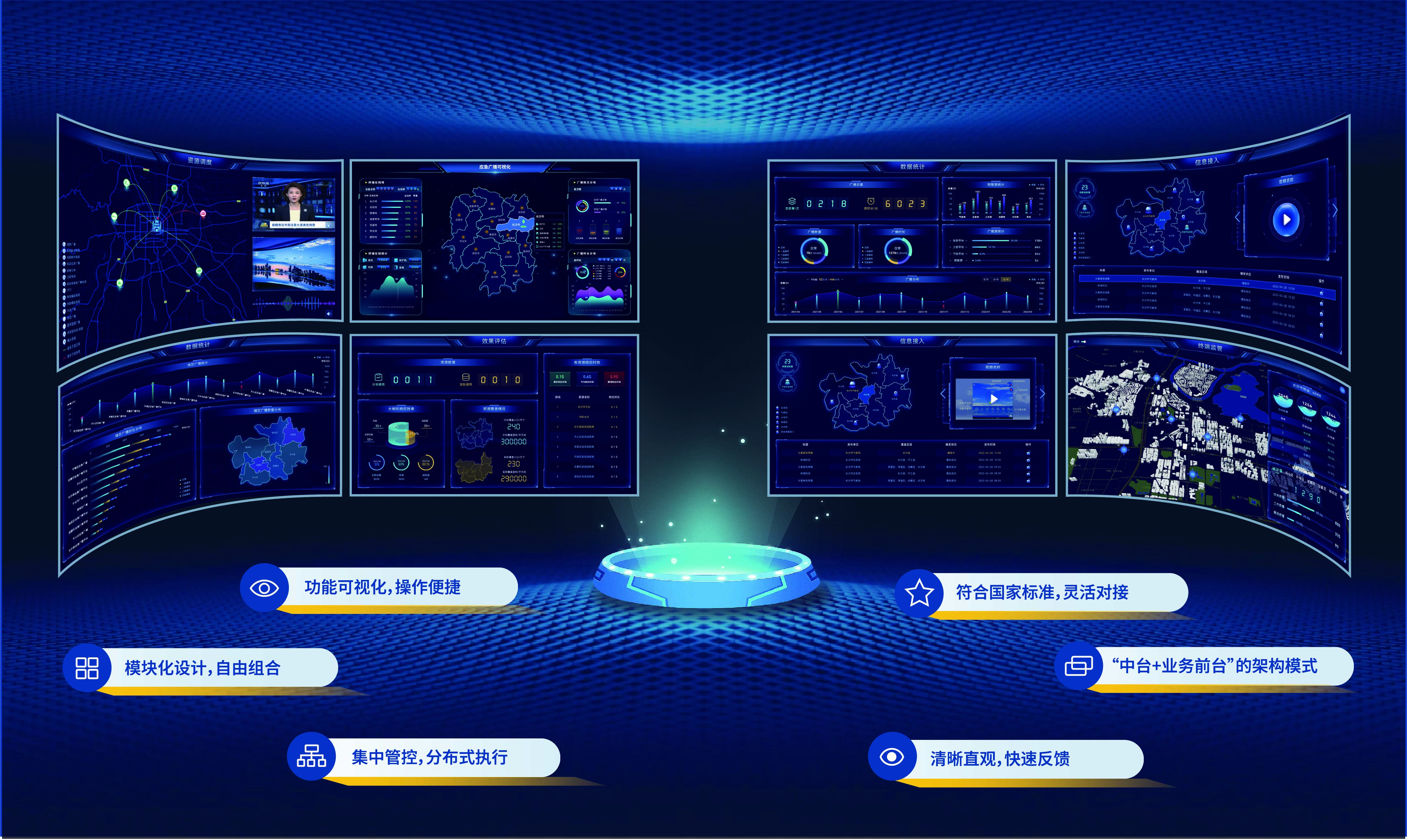 應急廣播平臺是針對應急突發事件的信息接入、處理、調度而研發的一款平臺軟件,采用模塊化功能設計,具備信息接入、資源調度、信息分發傳輸、節目制播、評估統計、資源管理、應急演練、運維管理、大喇叭管控、監播一體、可視化大屏等功能模塊。完全遵循GYT383-2023《應急廣播系統總體技術規范》,可根據區域需求,靈活部署到省、市、區縣任何一級,配合應急廣播大喇叭系統,可實現省、市、縣、鄉、村、點六級聯動,快速將應急指令傳達到時間影響地點。
