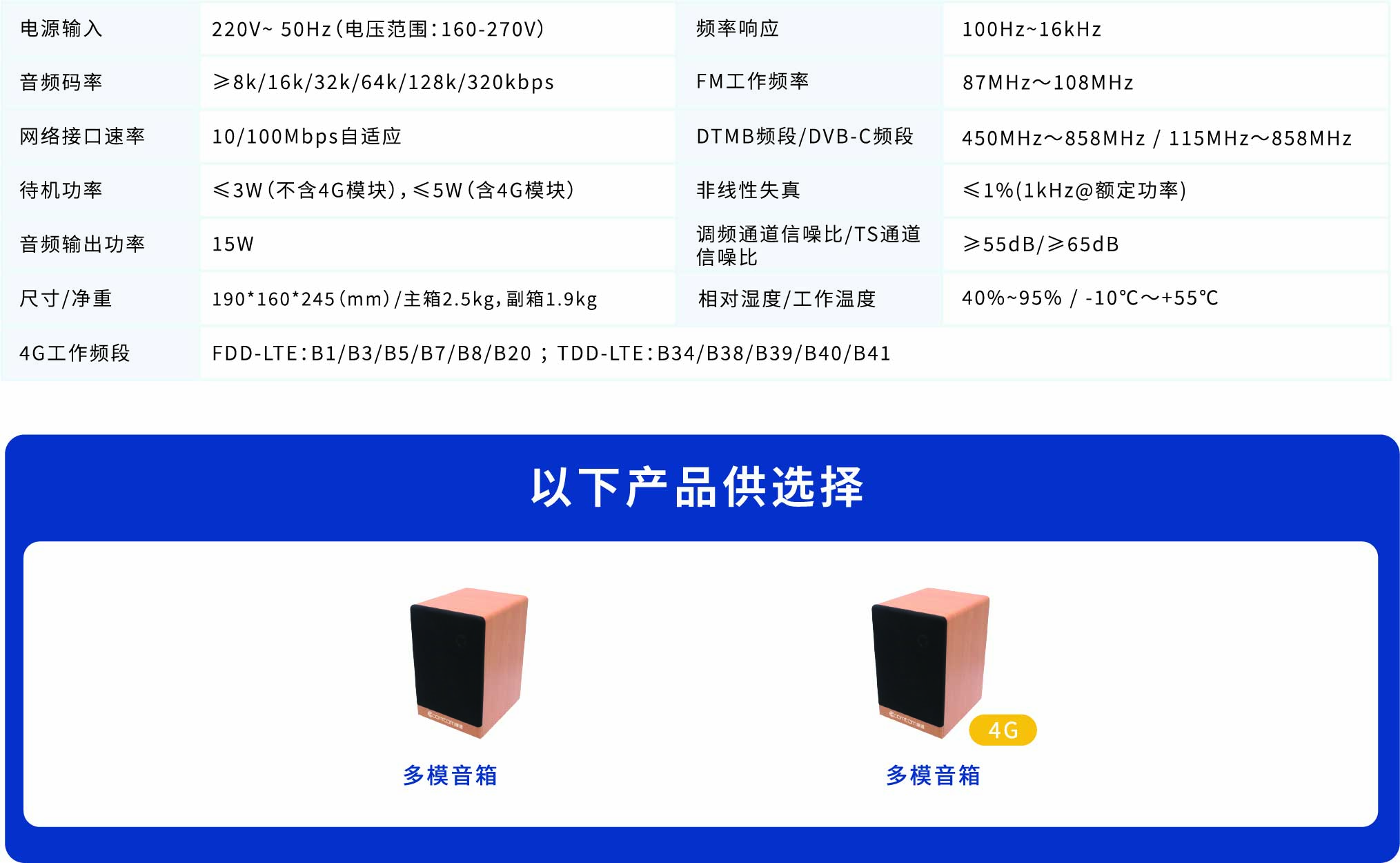 多模音箱是—款針對室內廣播的智能終端產品,是應急廣播系統中對廣播下發效果及廣播內容進行監聽的重要設備,是保障廣播合規合法的罣要手段。廣泛使用在播控中心或其他監管場景,可方便放置在播控臺。產品支持IP、TS、RDS和4G四種接收模式(可根據場景,選配模式),產品音頻部分采用高低音喇叭分頻設計輸出音質好,輸出功 率可達15W。