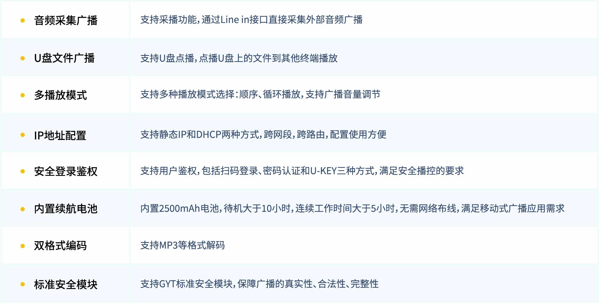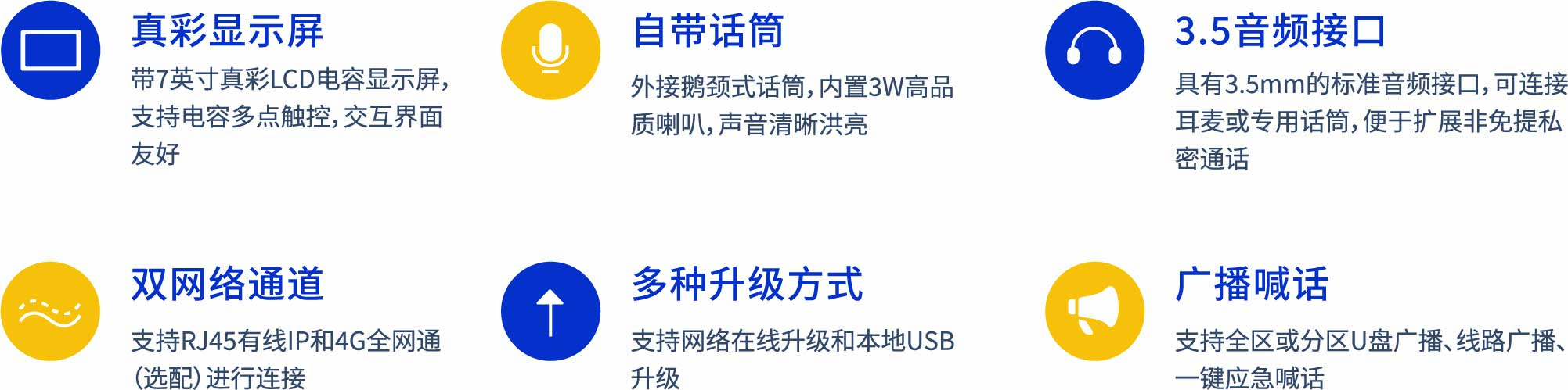 智能語音播控臺(以下簡稱播控臺)是一款集編碼、解碼于一體的智能前端設備,主要部署在廣播室或管理者(如鎮長、村長等)辦公室,常放置于播控桌或辦公桌上。用戶可以通過播控臺,快速對所管轄或指定的區域發布緊急廣播、日常通知等。播控臺提供話筒、U盤、線路輸入(外接專業音頻設備)多種輸入通道,提供高品質的數字音頻流廣播功能。該產品采用桌面式設計,精致美觀,工藝考究,現代感十足;使用7英寸全彩LCD顯示屏,觸控操作,簡單易用。