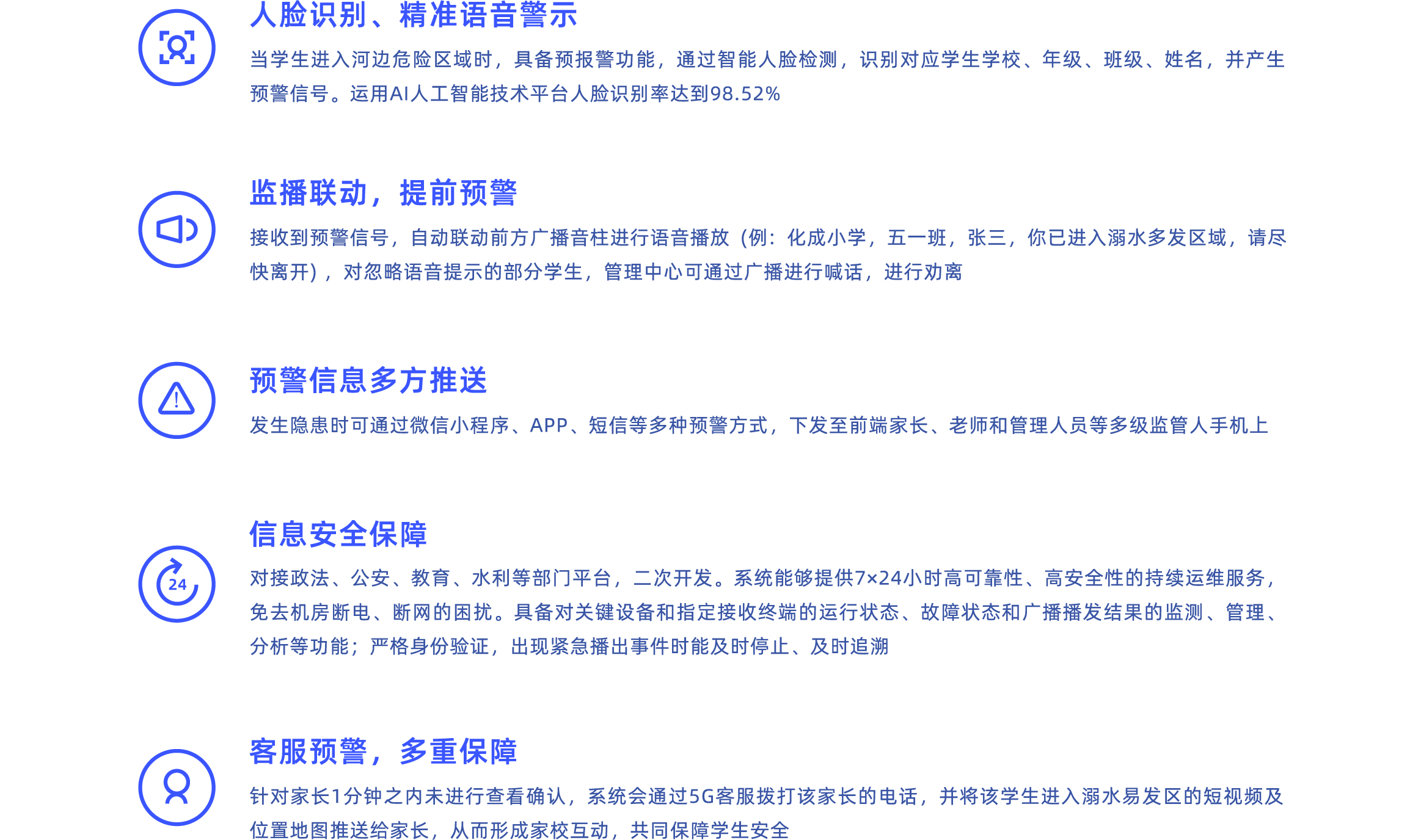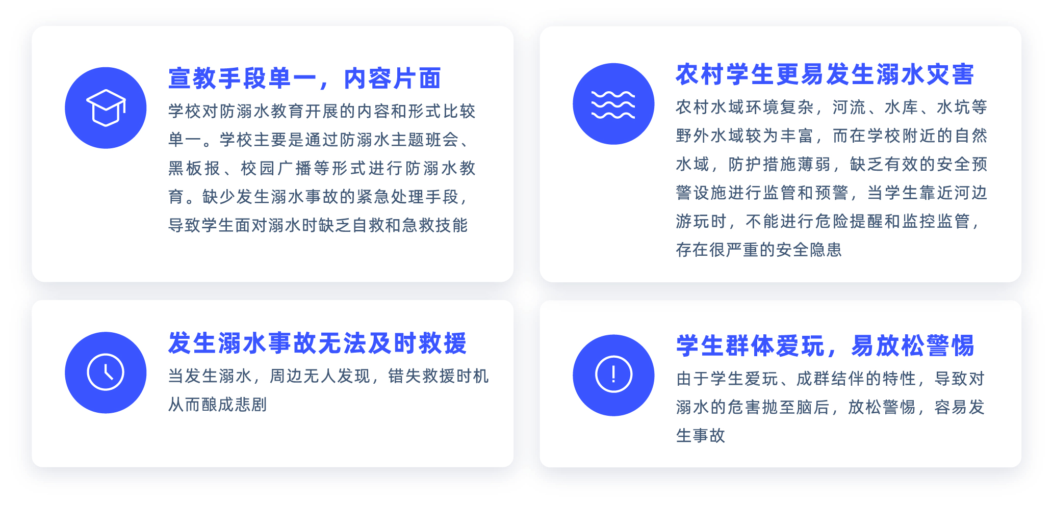 根據(jù)《2022 中國青少年防溺水大數(shù)據(jù)報告》顯示,我國每年約有 5.9 萬人死于溺水,其中未成年人占據(jù)95%以上。在我國,溺水、道路交通傷害、跌落、中毒等是構(gòu)成青少年傷害的常見類型。其中,因溺水造成的傷亡位居我國 0-17 歲年齡段首段,占比高達33%,1-14 歲溺水事故的比例超過40%。國務(wù)院教育督導委員會辦公室發(fā)布了2020年第3號預警,要求各地學校要加強宣傳防溺水知識以及溺水的危害,同時各級政府立即發(fā)布風險提示和預警,完善各類安全防護設(shè)施,加強巡檢,及時發(fā)現(xiàn)險情,妥善做好應急處置。預防學生溺水刻不容緩。